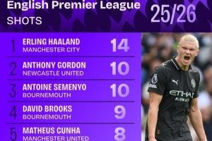 新赛季英超射门榜: